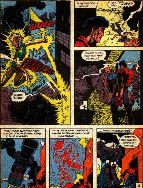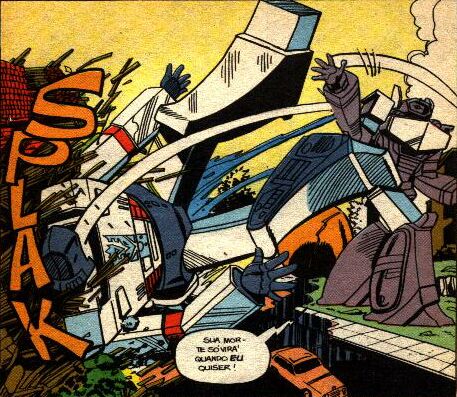 ![]() Shockwave coloca em ação seus planos de conquista, começando por um ataque à usina de G. B. Blackrock. O ataque acaba ferindo a responsável pela segurança e engenharia Josie Beller. Após tomar conta da usina, Shockwave ordena que os demais Decepticons rumem para lá. Megatron ouve as ordens e assiste seus soldados obedecendo-as. Fica furioso, mas nada pode fazer. ![]() Optimus Prime pede ajuda a Buster, mas o garoto não sabe o que fazer. Prime pede que ele desconecte os cabos em sua teste e os conecte nas próprias têmporas, para que eles façam um elo mental. Buster confia em Prime e faz o que ele pede. Há um lampejo de luz e dor, e o humano perde os sentidos. Fora da Arca, Ratchet vê Shockwave retornar e fica preocupado com Buster lá dentro. Shockwave vai conferir a recuperação de Megatron, e quando vira as costas, este se liberta dos cabos. Buster finalmente acorda e deixa a Arca. ![]() ![]() Megatron ataca Shockwave, que com a força do disparo do canhão de fusão, é enviado a quilometros de distância, atravessando as paredes da montanha e desabando em um campo de futebol. Pouco depois, Megatron vem para terminar o que começou, mas é recebido por Shockwave em seu estado totalmente operacional. Os dois lutam, mas Shockwave se aproveita da debilidade de Megatron e provoca-lhe um curto-circuito, quase o matando. Retornando à Arca, ele mostra o corpo de Megatron aos outros e os faz jurar obediência a ele. ![]() COMENTÁRIOS: Devido a um erro grosseiro, Ratchet aparece no último quadrinho com um símbolo Decepticon pintado em sua lataria. ![]() |