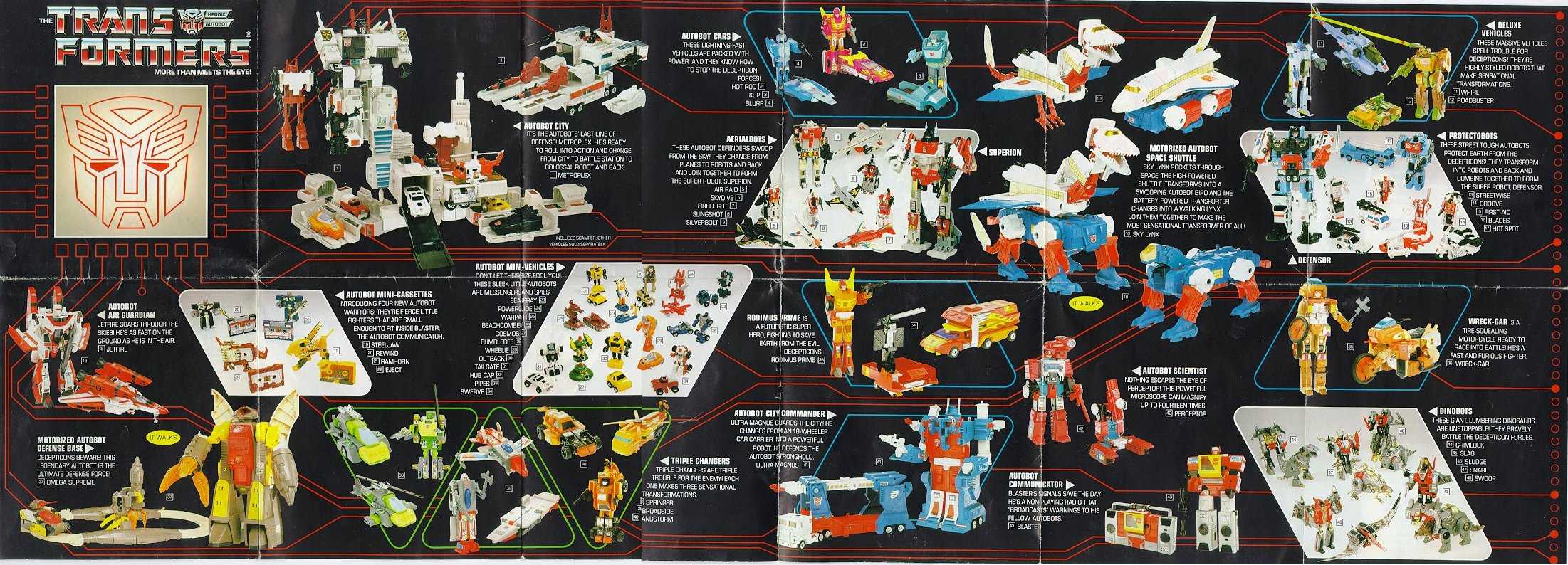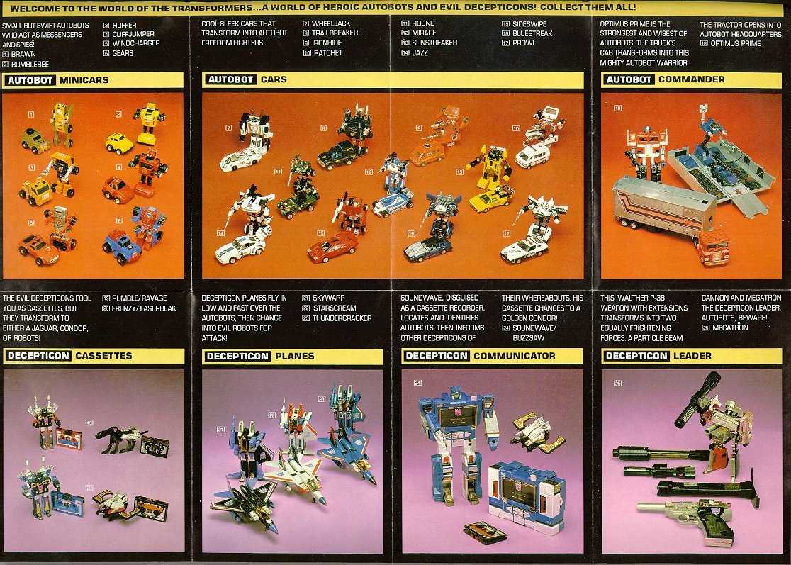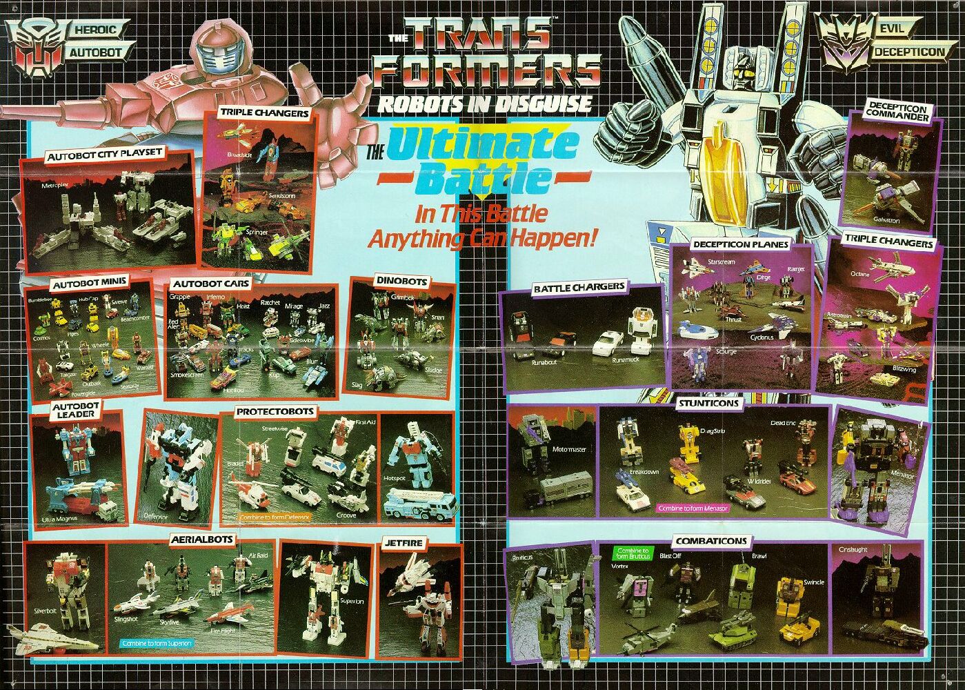Autobots (Metroplex, triple changers, Protectobots, Dinobots, Aerialbots, etc) e Decepticons (Galvatron, battle chargers, triple changers, Stunticons, Combaticons, etc).