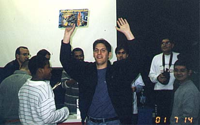 O feliz ganhador de um dos brinquedos que foram sorteados.