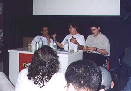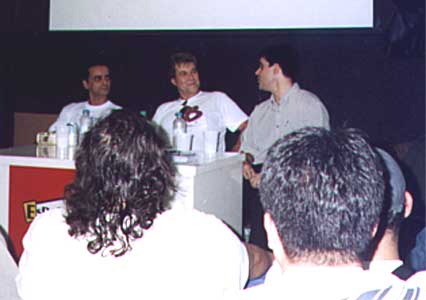 Guilherme Briggs (Optimus Primal de "Beast Machines" e Optimus Prime de "Nova Geração"), Celso Vasconcelos (Optimus Prime de "Transformers") e Romeu D'Angelo (Darkscream de "Nova Geração") dando autógrafos.