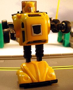 Bumblebee (Autobot - minicar - Transformers G1):Tamanho do toy: Basic (ou o conhecido “minicar”) Esquema de cores: A cor que predomina nele é o amarelo, que faz seus pés, da cintura até os ombros e uma parte da cabeça, as pernas e os braços são pretos. A cabeça é onde tem uma variação maior de cor, pois é parcialmente amarela, cinza na região da “boca” e cromado na região em que se sustenta a cabeça, isso no modo robô, pois no modo carro, ele é praticamente todo amarelo, só os vidros são escuros, os paralamas dianteiros e traseiros. As rodas são cromadas e o fundo dele no modo veiculo é preto (que seria as costas deles no modo robô). Eu já vi toys Bumblebee também nas cores cinza, vermelho, laranja e dourado. Transformação: A transformação do Bumblebee é muito fácil, qualquer um consegue transforma-lo sem muitas dificuldades. Se ele estiver no modo carro você tem que apenas seguir 3 passos: primeiro você puxa a parte da frente carro (não precisa ser necessariamente nessa ordem), depois você puxa a roda dianteira e traseira esquerda, depois dianteira e traseira direita, que seriam os braços, na parte de trás tem uma peça cromada (poderia até chamá-la de tampa que da acesso ao motor) puxando essa peça para baixo você tem a cabeça, para finalizar a transformação, basta puxar todo corpo para cima mas conservar a parte dianteira do carro (ou os pés do robô) na mesma posição.