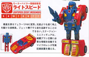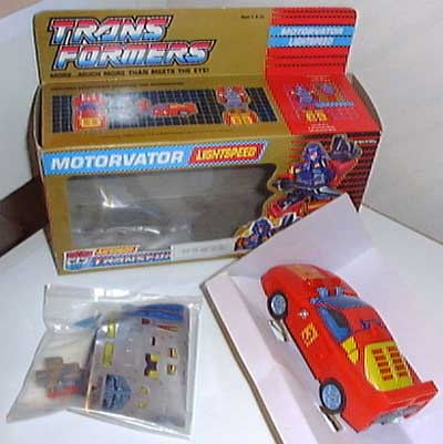 Detalhes do brinquedo: Produzido exclusivamente para o mercado europeu, Lightspeed é um repaint de Braver, que foi lançado para a 6ª temporada (essa temporada não chegou a ser animada, permanecendo apenas nos quadrinhos europeus). Não há muito o que falar de Lightspeed, pois, de todos os Motorvators, é o que mais se parece com o original. Apesar de pouco perceptível, o tom azul de seu corpo está ligeiramente mais claro do que o original. A mesma alteração pode ser notada no seu visor, que de vermelho passou a ser laranja. Suas pernas também tiveram uma troca de cor, apresentando uma parte amarela, que no original era cinza e sem detalhes coloridos. A mesma troca de cor pode ser percebida nos adevivos aplicados na forma de veículo, que de brancos também passaram a ser amarelos.